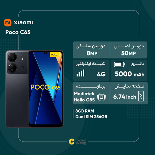 شاید شما هم به دنبال خرید گوشی هوشمندی باشید که در کنار بهره بردن از مشخصات فنی مناسب، قیمت مقرون بهصرفهای هم داشته باشد و شیائومی Poco C65 میتواند یکی از انتخابهای مناسب برای شما باشد. این گوشی به نسبت قیمت در نظر گرفته شده از مشخصات فنی مناسبی بهره برده است. در نمای روبهرویی این گوشی به صفحهنمایش با ابعاد 6.74 اینچ و رزولوشن 720×1600 پیکسل از نوع IPS مجهز شده که توانایی نمایش 260 پیکسل در هر اینچ را دارد. در مورد صفحهنمایش این گوشی باید بگوییم که باید توقعی در حد و اندازه یک گوشی اقتصادی را از آن داشته باشید و از طرفی نرخ بروزرسانی 90 هرتز آن سبب شده تا عملکرد به نسبت روان و بدون لگ داشته باشد. در قسمت پشتی این گوشی شاهد قرارگیری یک سنسور دوربین اصلی با رزولوشن 50 مگاپیکسل در کنار سنسور 2 مگاپیکسل ماکرو هستیم. سنسور دوربین اصلی 50 مگاپیکسل این گوشی برای عکاسی در نور روز و در جایگاه یک گوشی میانرده میتواند توقعات شما را تا میزان بسیار زیادی برآورده کند. دوربین سلفی 8 مگاپیکسل هم برای برقراری تماسهای تصویری عملکرد بسیار خوب و کاملا قابل قبولی دارد. حضور پردازنده هلیو G85 شرکت مدیاتک هم سبب شده تا شیائومی Poco C65 در اجرای بازیهای نهچندان سنگین و فعالیتهای روزمره، عملکرد روان و مناسبی داشته باشد. این گوشی به باتری با میزان ظرفیت 5000 میلیآمپرساعت مجهز شده که باید بدانید به ازای هر بار شارژ صد درصدی، توانایی ارائه زمان آماده بهکار یک و نیم روز را برای حالت استفاده معمولی دارد. در مجموع باید بگوییم که با یک گوشی به نسبت اقتصادی روبهرو هستید که به ازای قیمت در نظر گرفته شده از مشخصات مناسبی بهره برده و از طرفی برای استفاده روزمره گزینه بسیار مناسبی است.